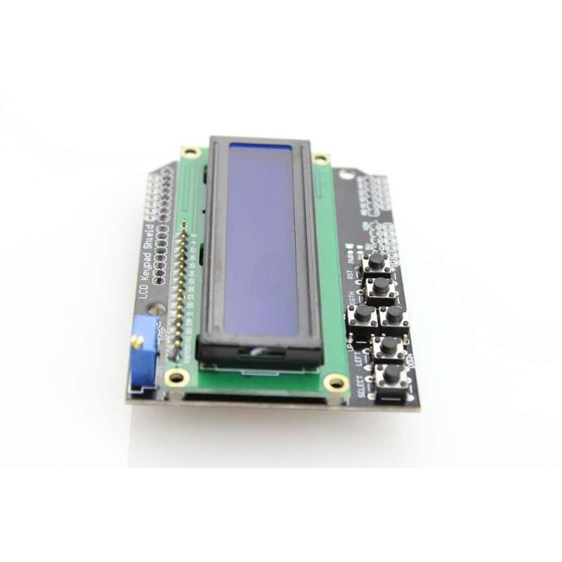 Shield para Arduino Uno, Arduino Mega 2560 e placas compatíveis. Com display LCD 16×2 azul e 5 teclas configuráveis. Com este shield você monta rapidamente um sistema de seleção por menus ou utiliza os comandos para acionamento de atuadores, motores, sensores, etc.
