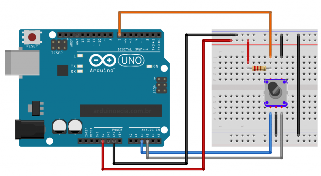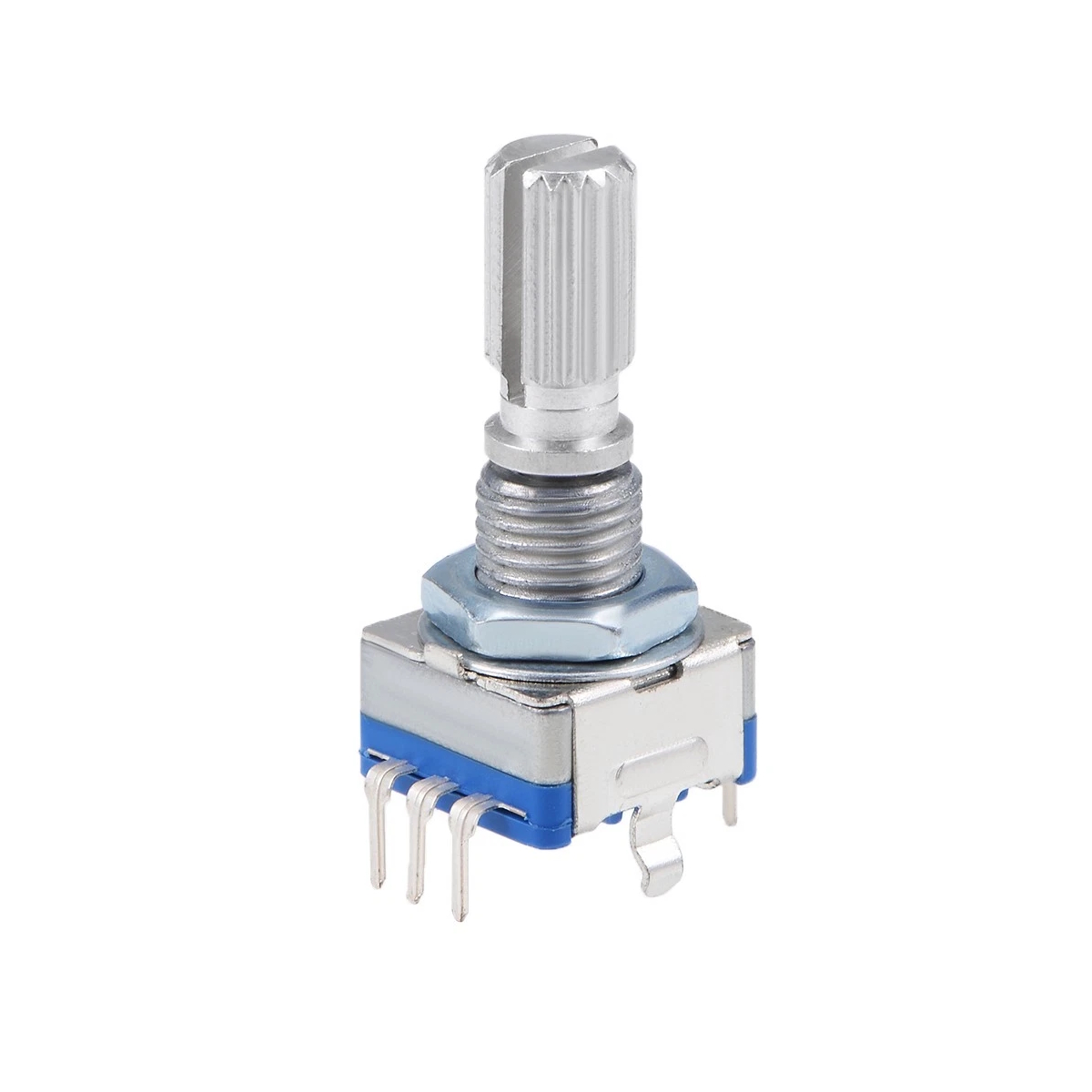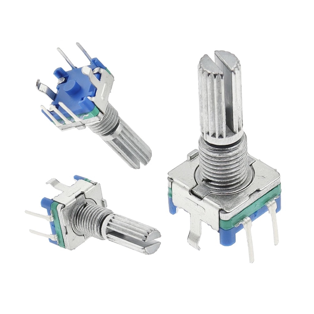Encoder rotativo com chave central para utilização em projetos eletrônicos. O Encoder rotativo permite uma maior precisão no ajuste de circuitos, sendo usado como controle de volume, seleção de menus em telas LCD e outras aplicações.