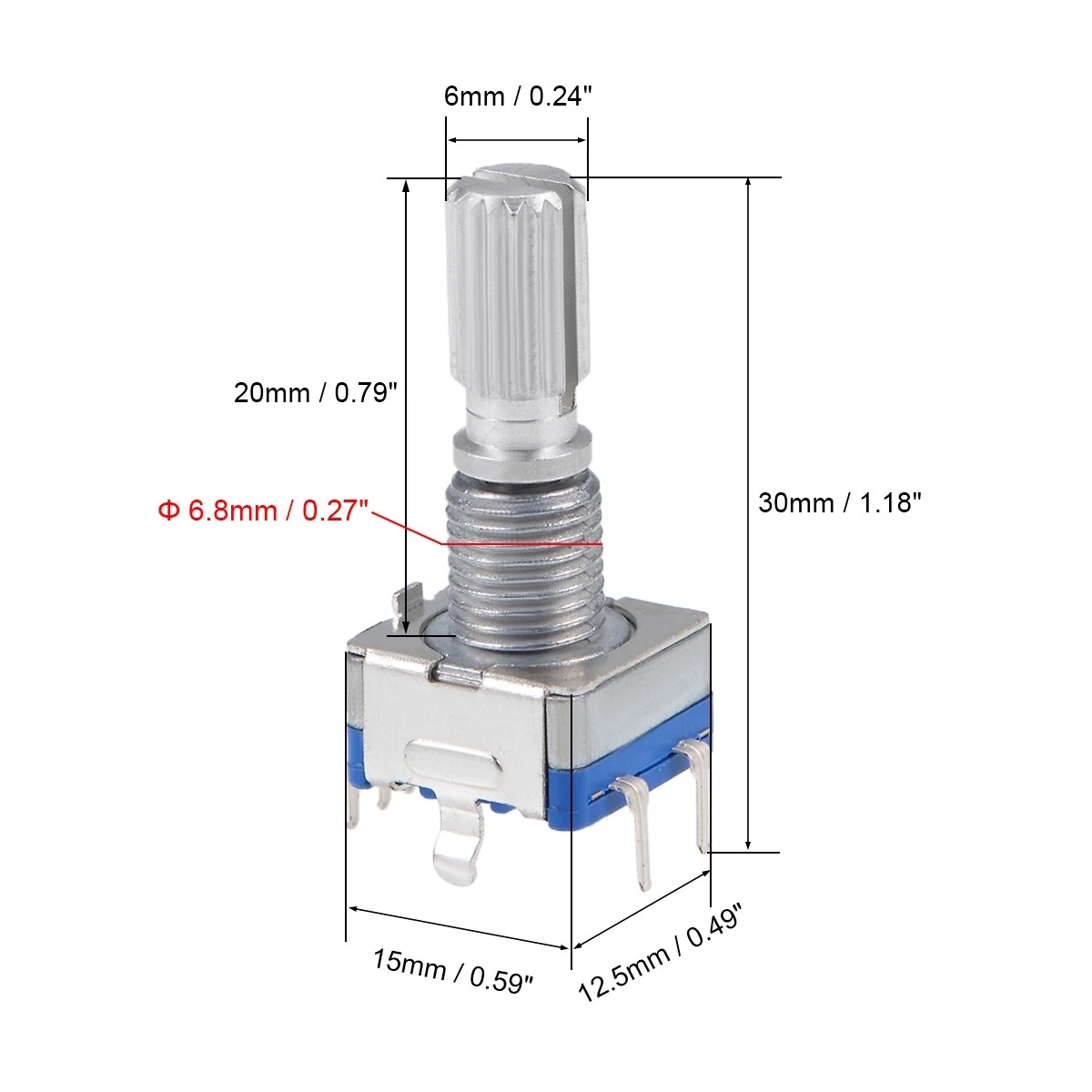 O Encoder EC11 possui 5 terminais para conexão e controle. Consulte as imagens do anúncio para verificar as dimensões do componente.