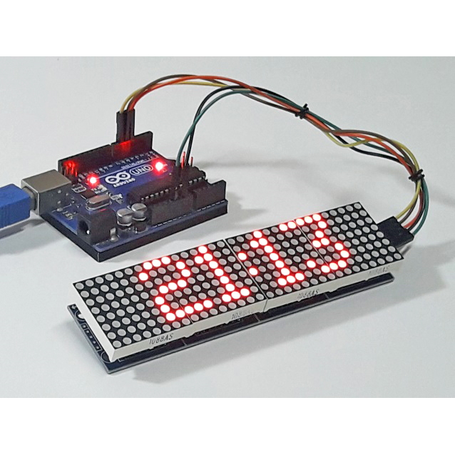 Composto por 4 matrizes 8x8 e controlados pelo CI MAX7219, é ideal para mostrar informações como data, hora, coordenadas, temperatura, contadores e uma infinidade de outras opções.